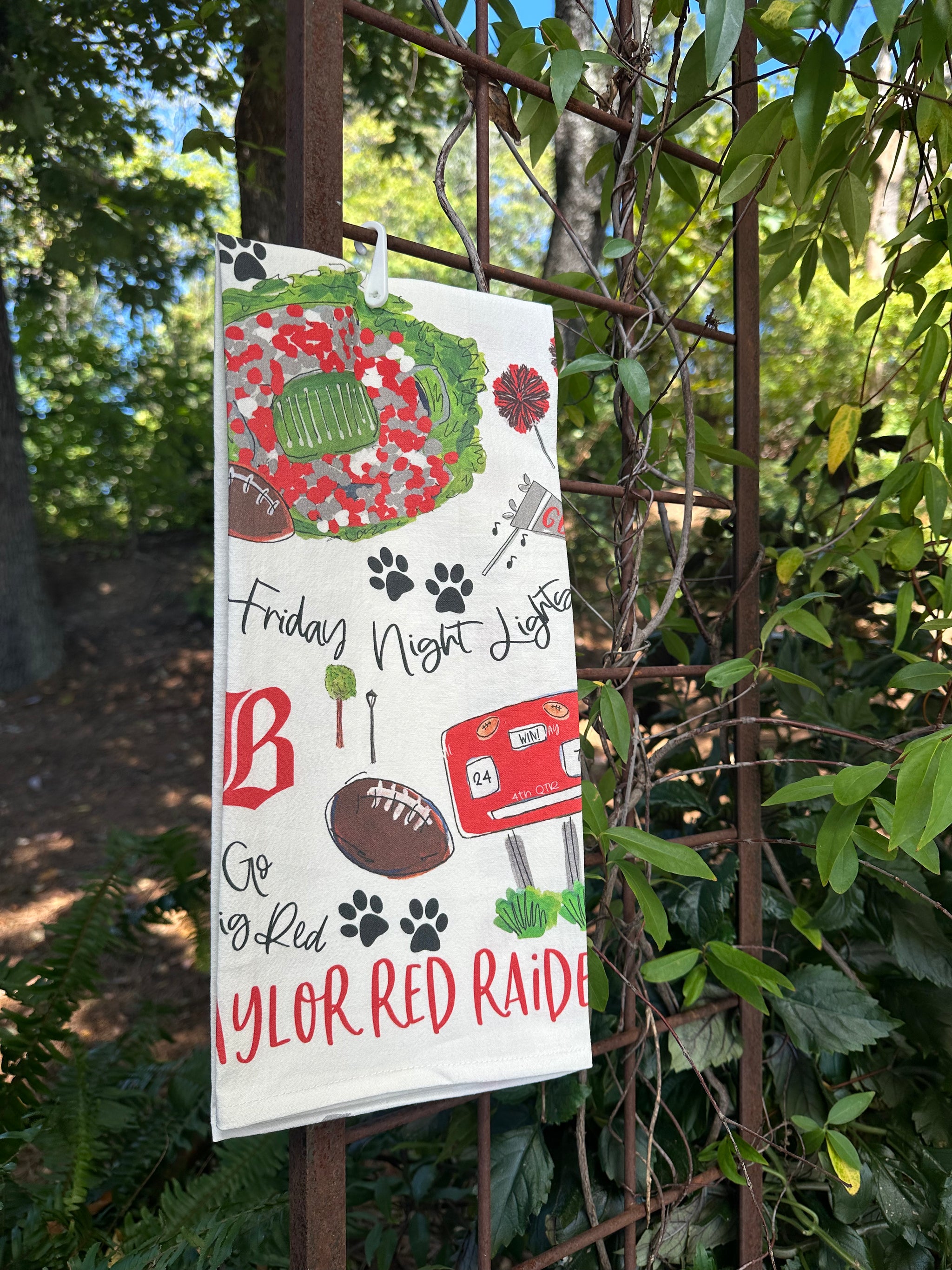 Cotton Tea Towel showcasing all the places that make Baylor so special on a Saturday! Artwork by Rachel Walker.