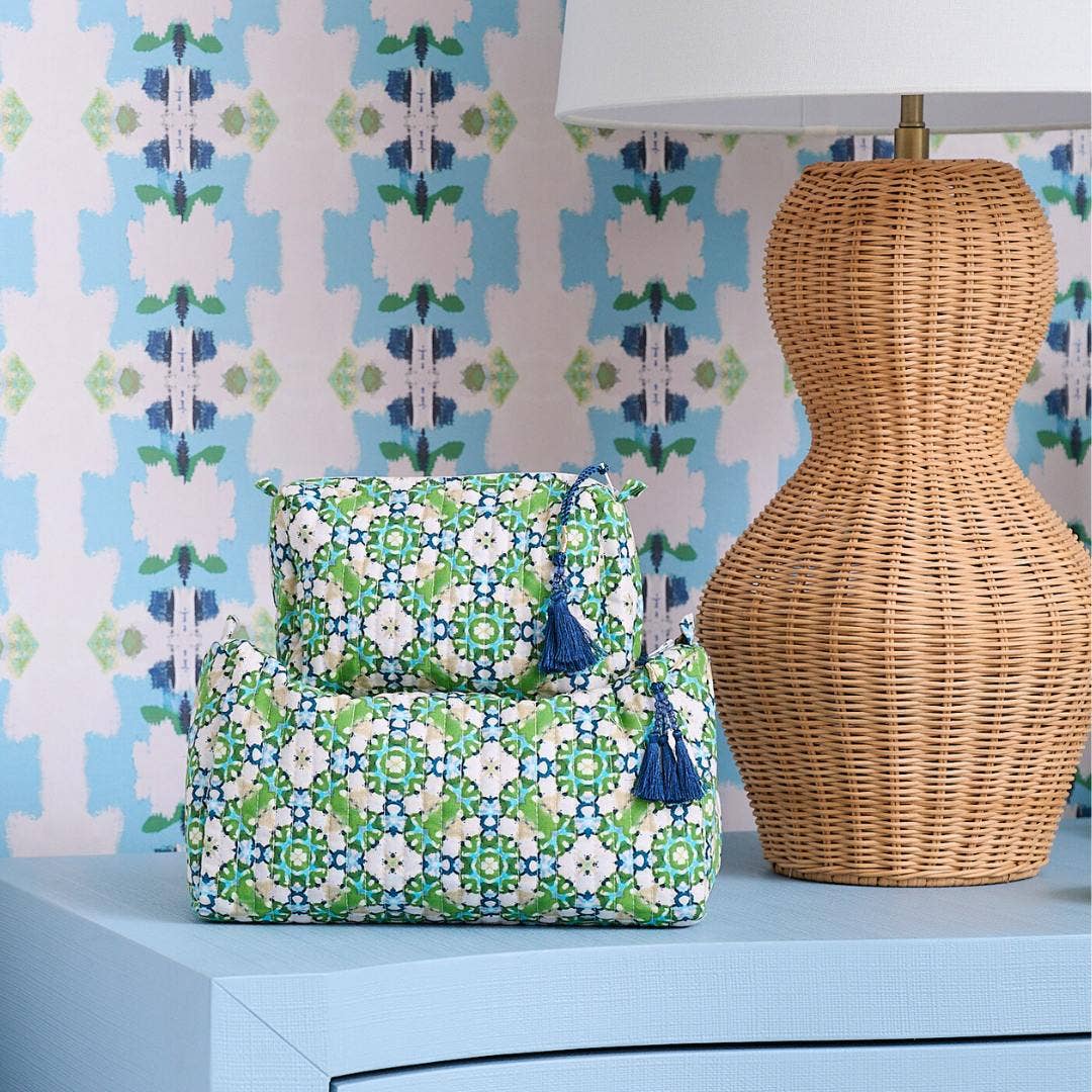A fresh take on a travel essential. These cosmetic bags are your new go-to beauty bag. Lined with a plastic interior to make minor spills no big deal. -Fabric: 100% Cotton -Plastic lined interior -Zipper includes colored tassel -Size Large: 10.5" x 4.5" x 5.7" -Please note that dye lots may vary from batch to batch and imperfections may occur. -Care Instructions: Machine wash cold, tumble dry low. Interior can be wiped clean. -Made in India