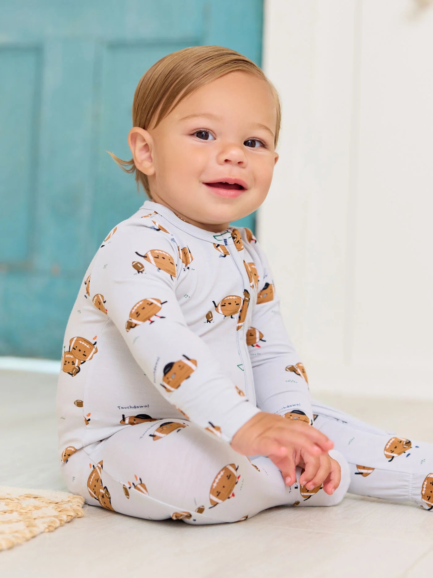 Get your future all-star ready for dreamland with our adorable Playful Footballs Footie! This cozy one-piece sleeper is covered in a charming print of friendly footballs, perfect for inspiring big dreams of touchdowns and victory.