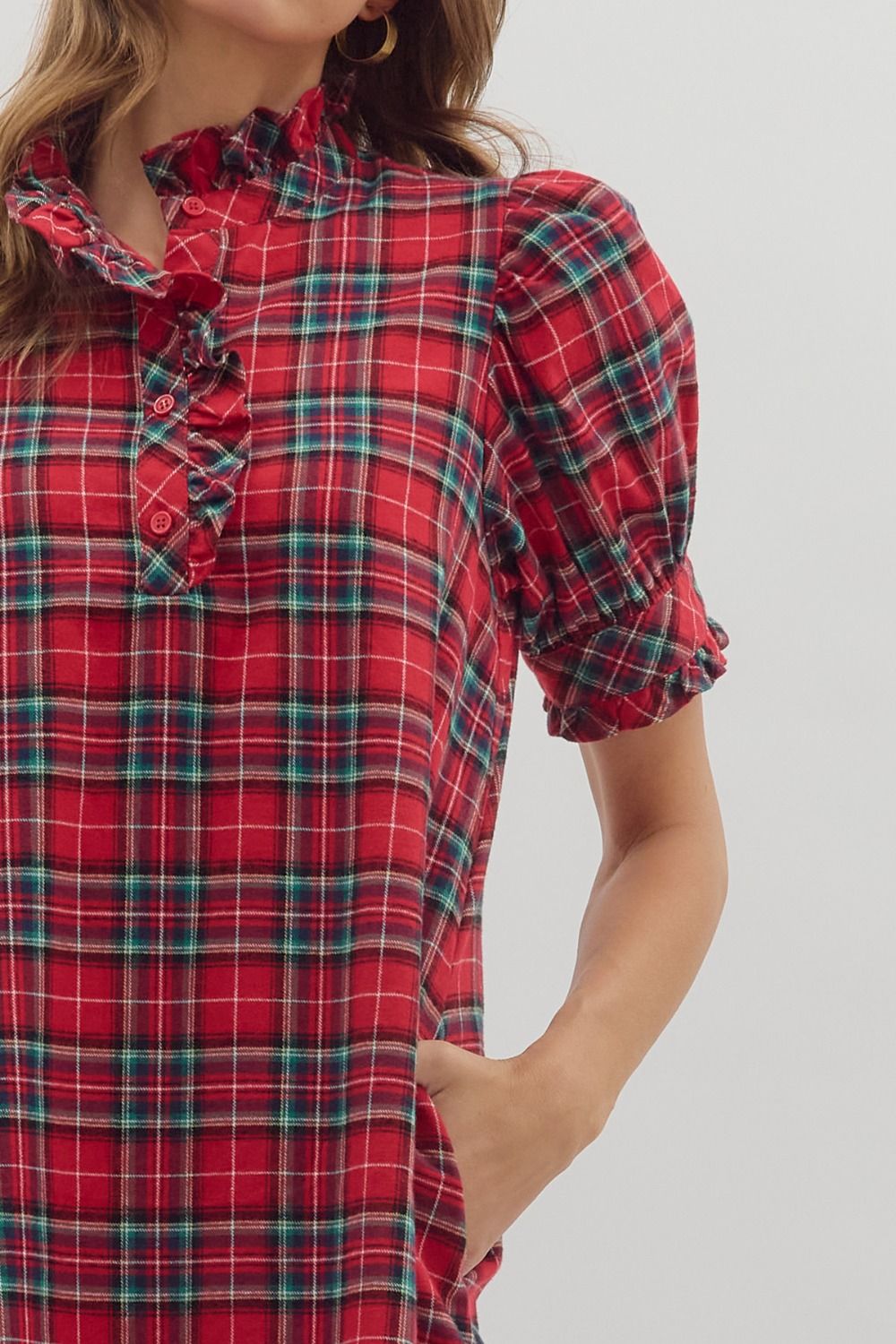 Plaid short puff sleeve mini dress featuring a ruffled mock neck and button-up front with crisscross detail. Includes side pockets. Lined. Woven. Non-sheer. Lightweight.Plaid short puff sleeve mini dress featuring a ruffled mock neck and button-up front ruffled accent. Side pockets. Lined. Woven. Non-sheer. Lightweight.