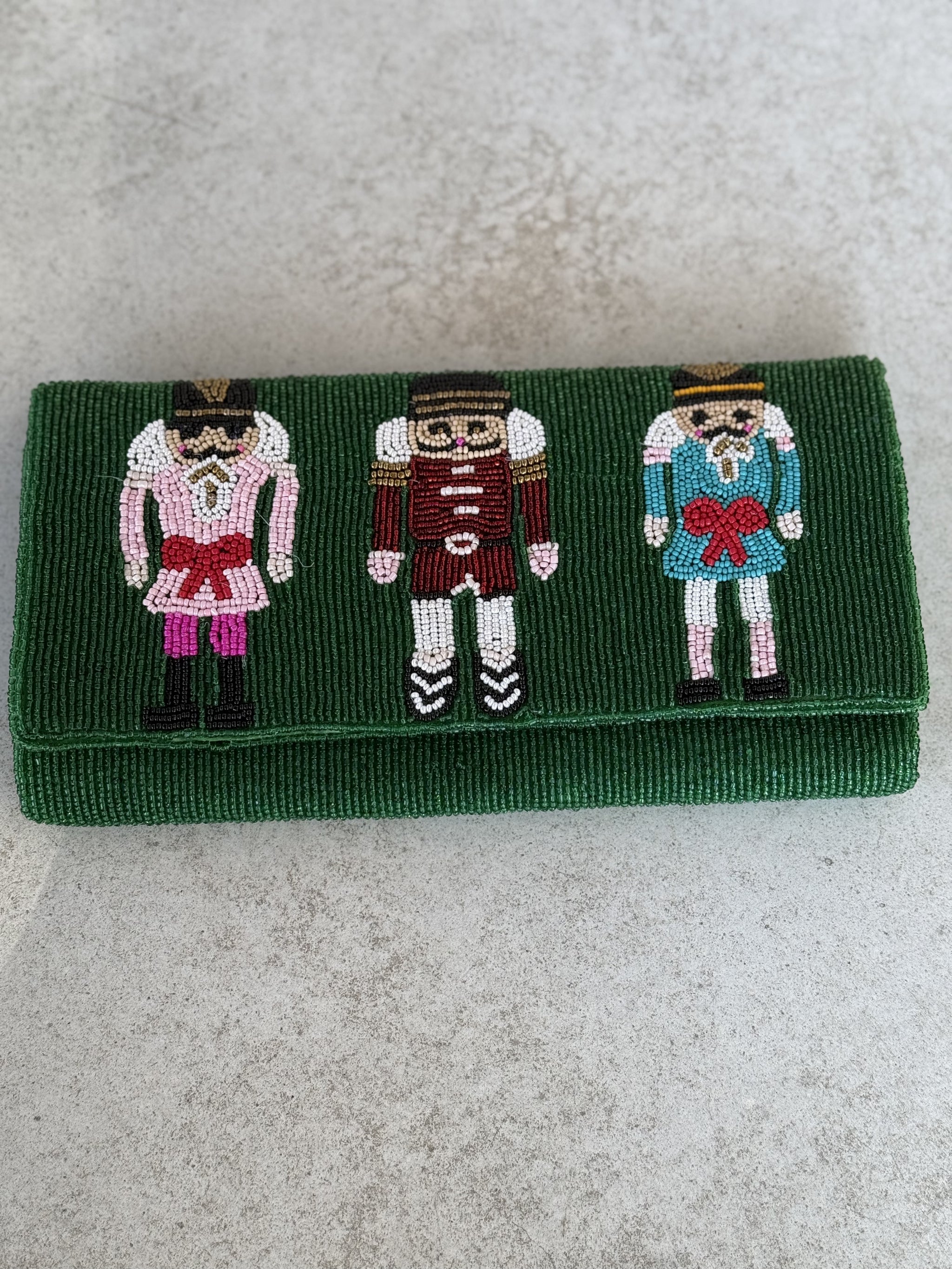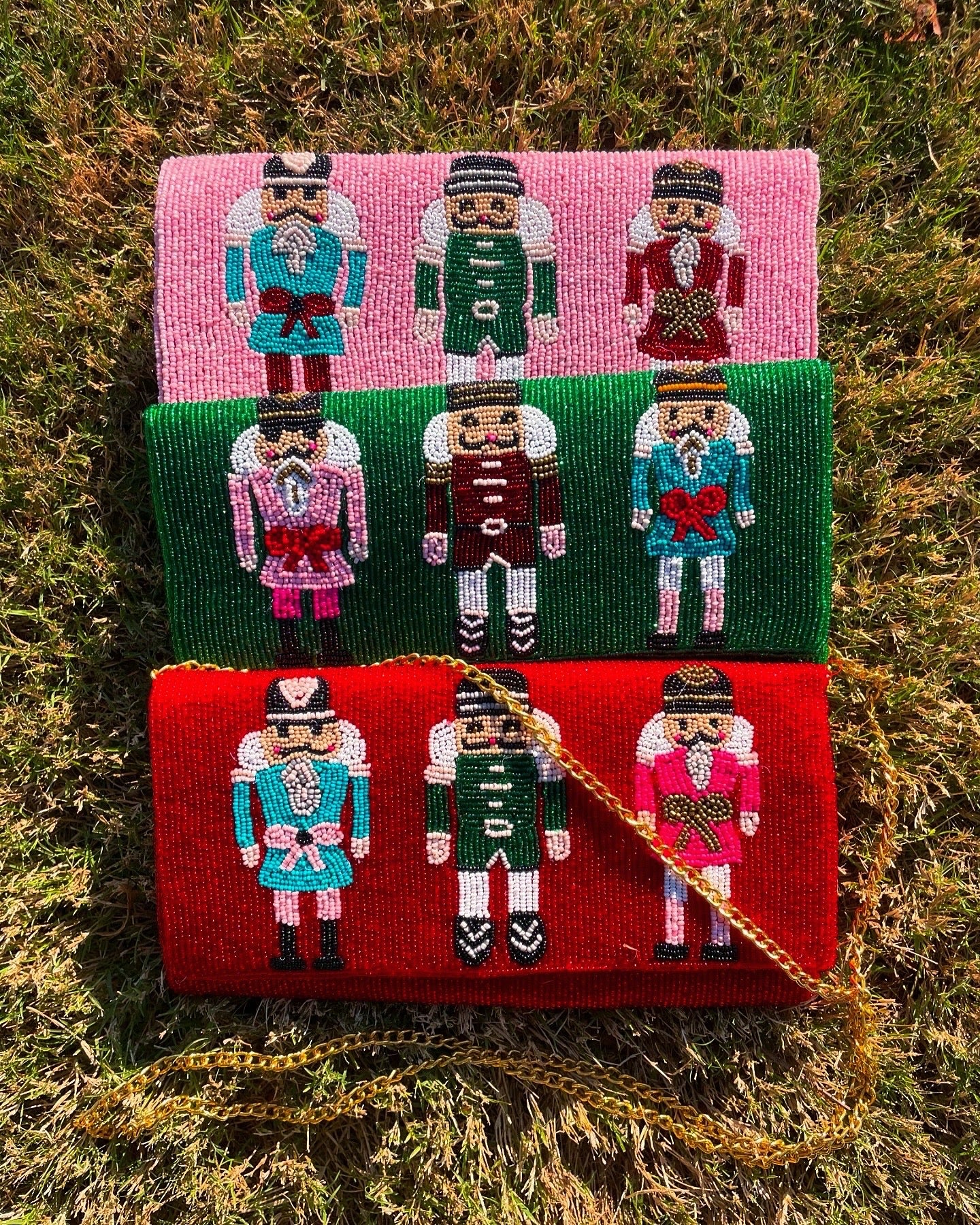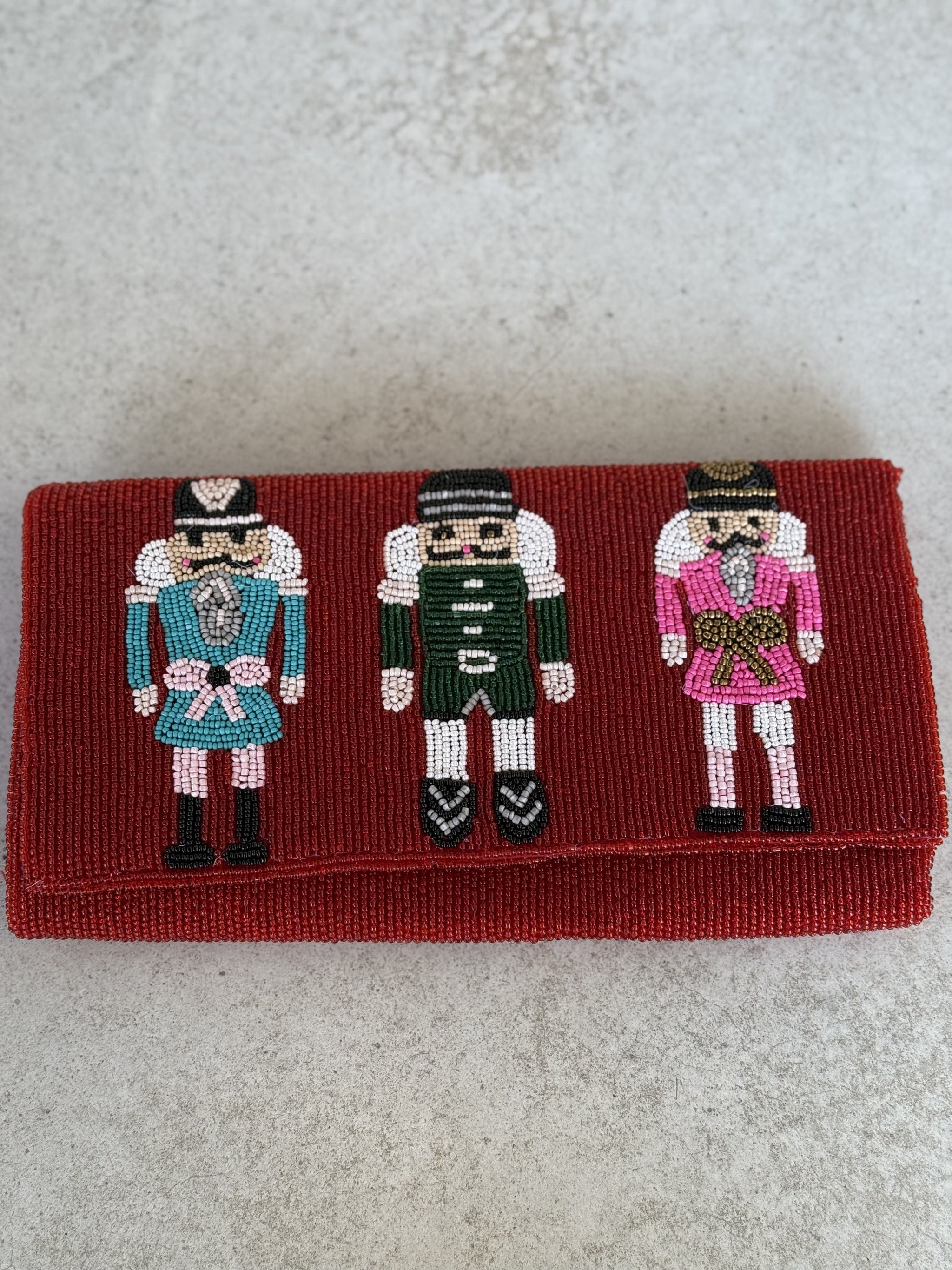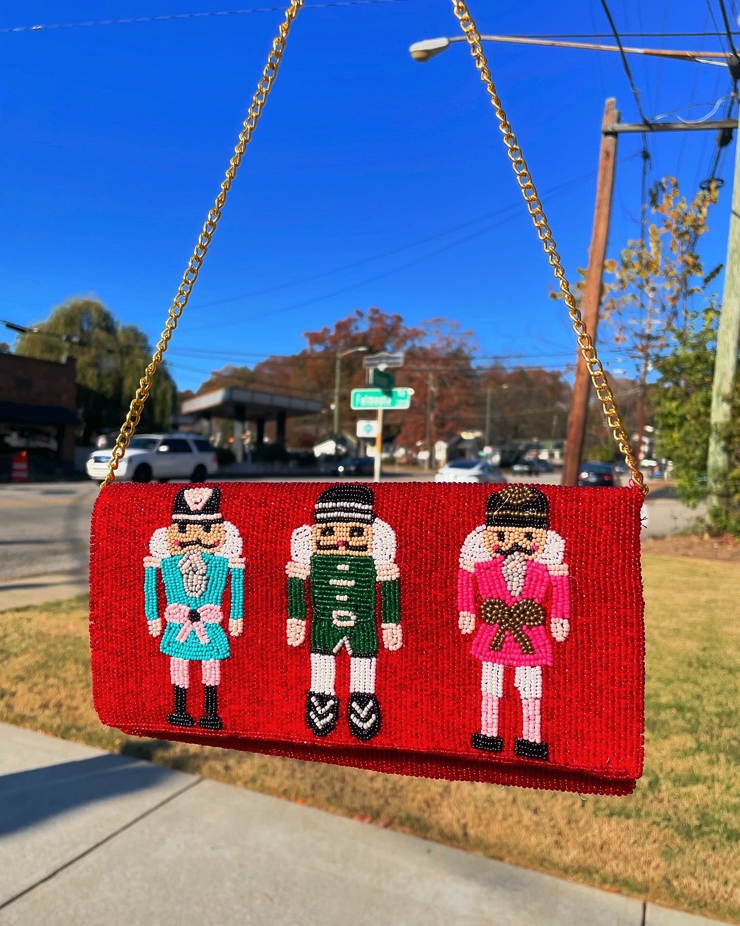 Hand beaded clutch featuring three nutcrackers. Each bag comes with a gold chain strap. 10" w x 6" h