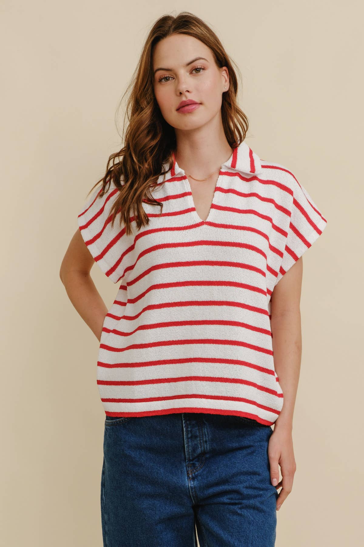 STRIPED COLLARED V NECK TOP